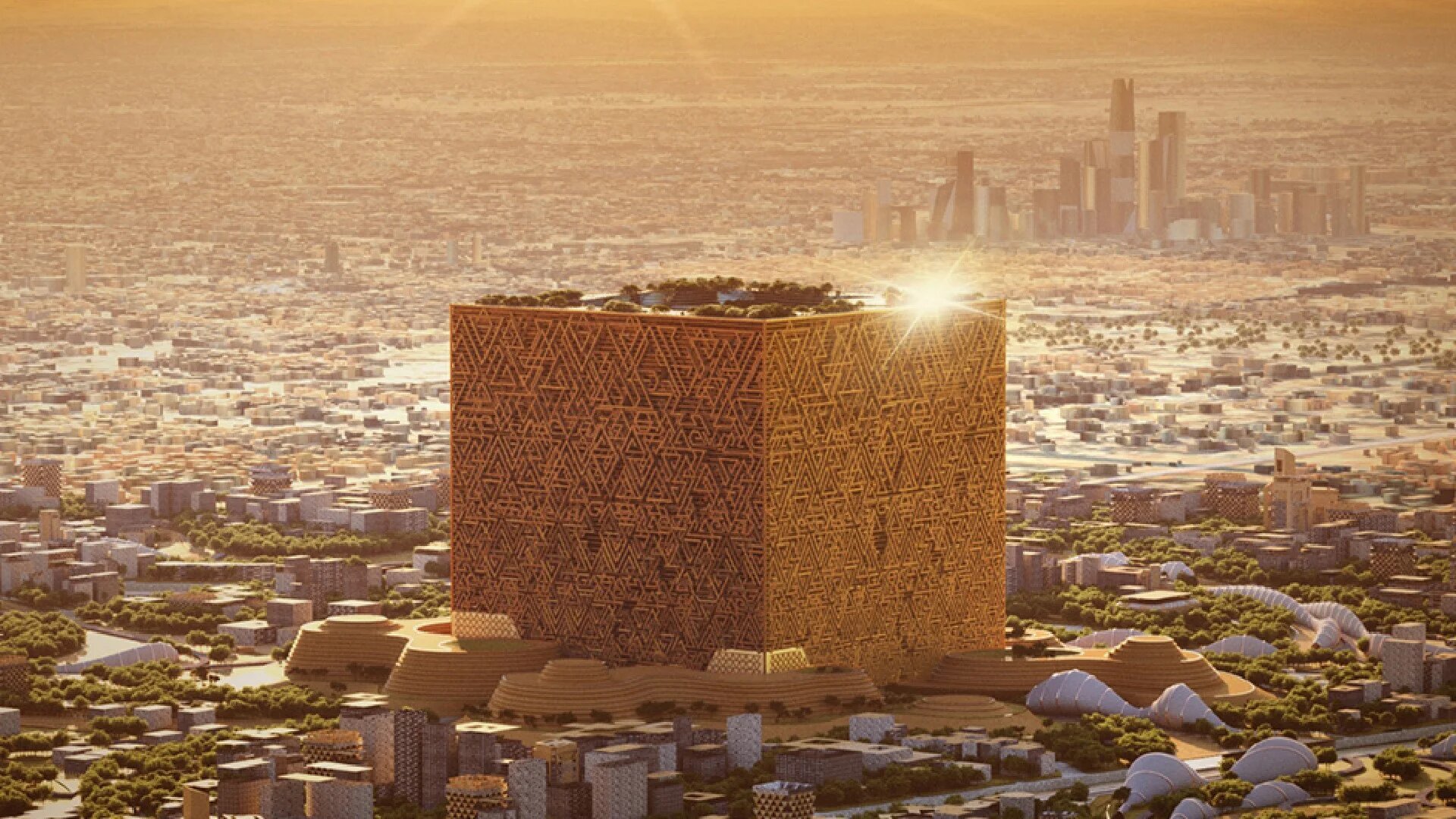 The Mukaab was envisaged as a 400-metre-by-400-metre cuboid with an interior designed to house cultural, retail, hospitality and immersive digital attractions, featuring a more than 300-metre-tall terraced ziggurat and an artificial intelligence-powered dome display.